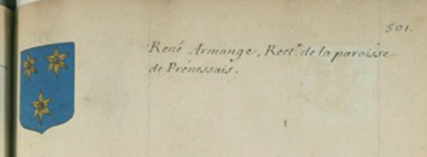 Un blason : comme toutes les familles, en cherchant bien, il y a toujours un de nos ancêtres qui a eu son blason. Dans l'Armorial général établi par d'Hozier, volume 8 (Bretagne 1) nous trouvons à la page 501 le blason du recteur de la paroisse de Prenessay, René Armange Pour l'écolo de service, ces fleurettes sont bien sympathiques !